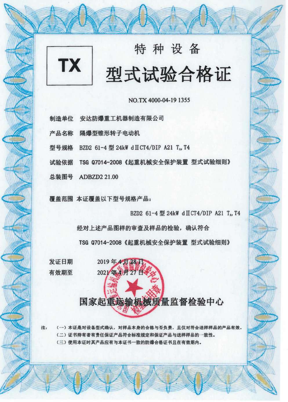隔爆型錐形轉(zhuǎn)子電動機 TX型式試驗合格證
