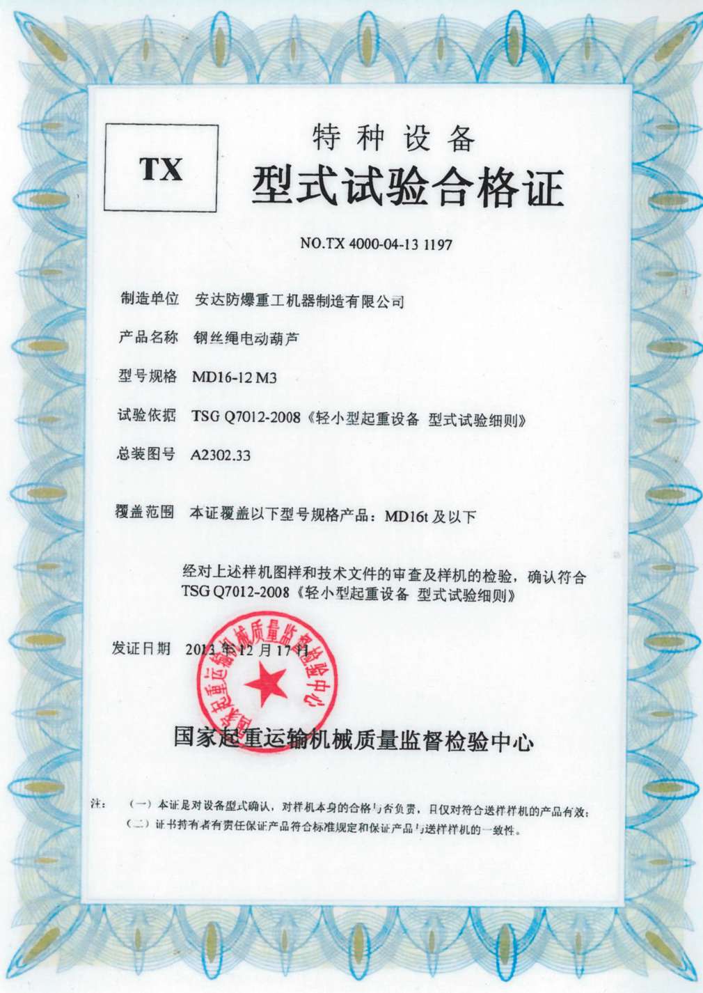 榮譽(yù)資質(zhì) 鋼絲繩電動(dòng)葫蘆 TX型式試驗(yàn)合格證