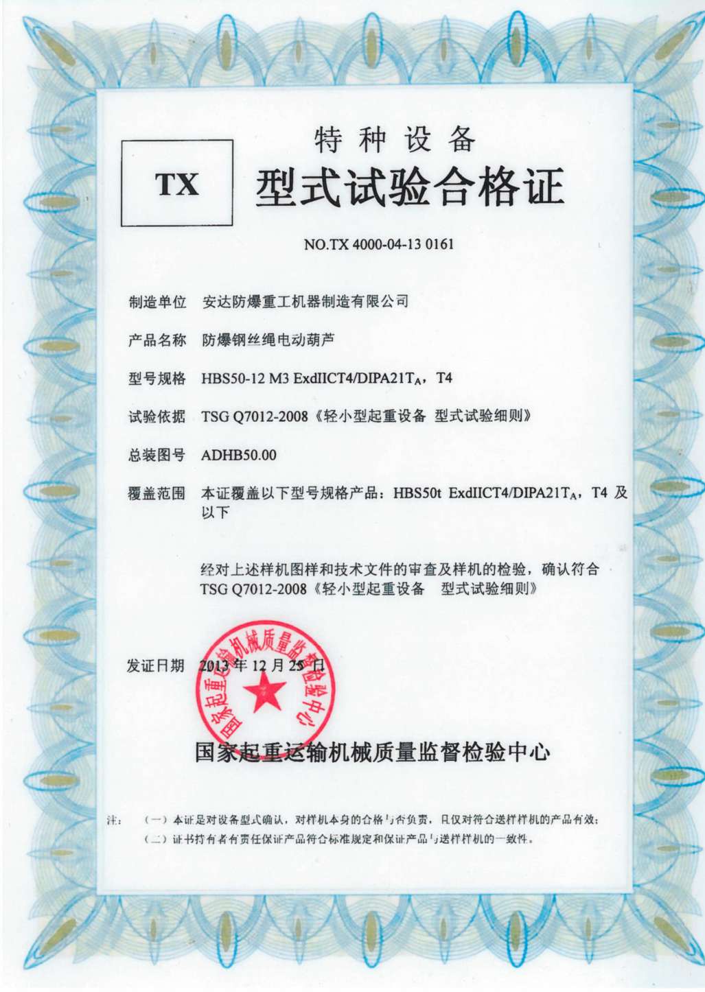 » 防爆鋼絲繩電動葫蘆 TX型式試驗合格證
