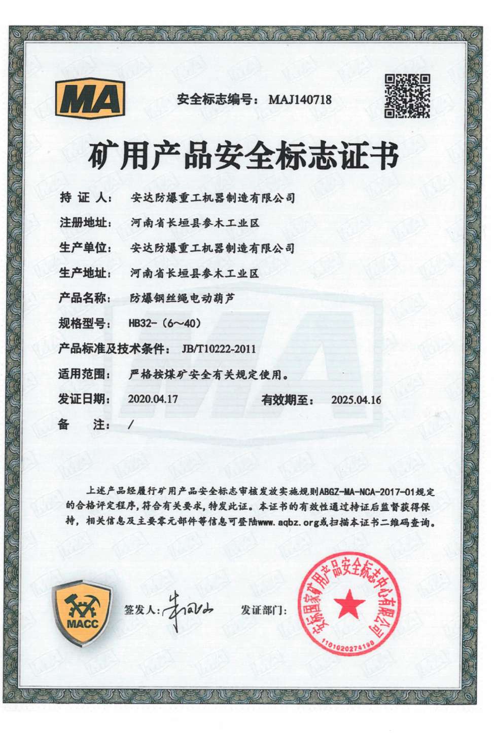 榮譽資質(zhì) 防爆鋼絲繩電動葫蘆 礦用產(chǎn)品安全標(biāo)志證書