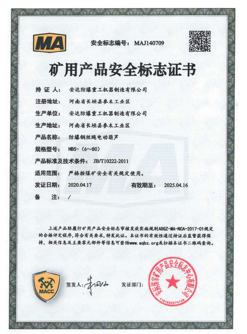 防爆鋼絲繩電動葫蘆 礦用產品安全標志證書