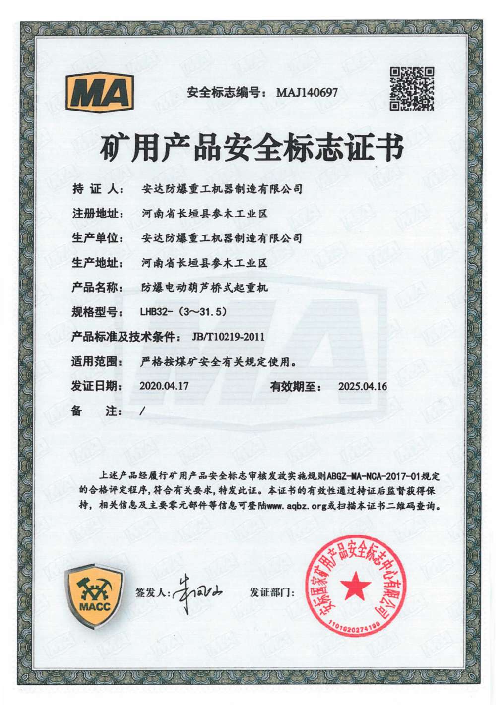 您當(dāng)前的位置:首頁(yè) » 榮譽(yù)資質(zhì) » 防爆鋼絲繩葫蘆橋式起重機(jī) 礦用產(chǎn)品安全標(biāo)志證書(shū)