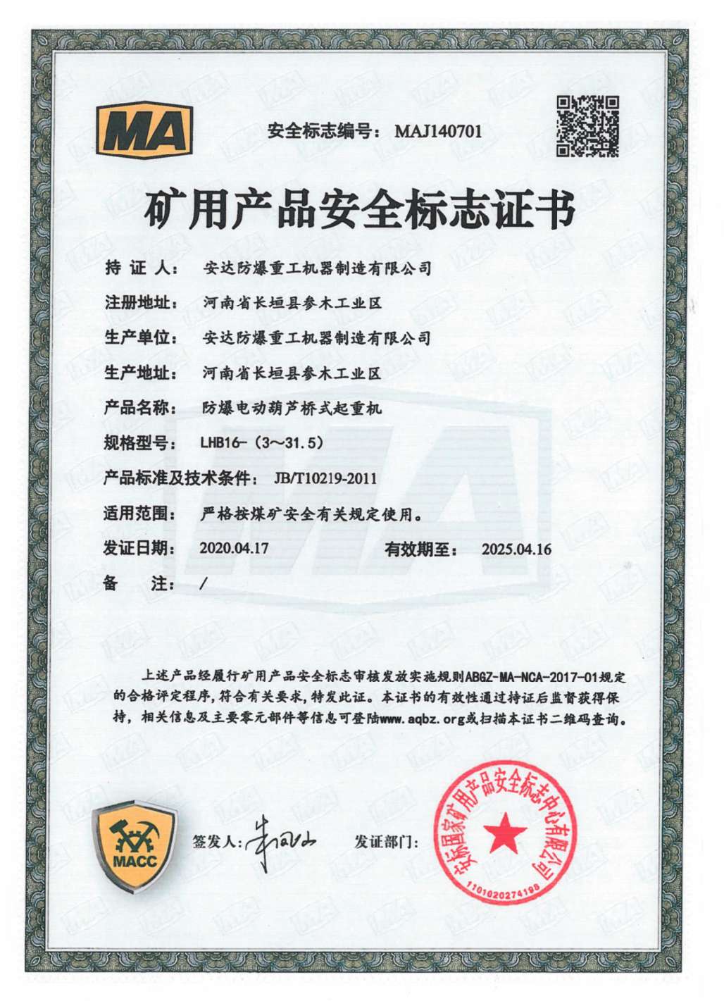 榮譽(yù)資質(zhì) 防爆鋼絲繩葫蘆橋式起重機(jī) 礦用產(chǎn)品安全標(biāo)志證書