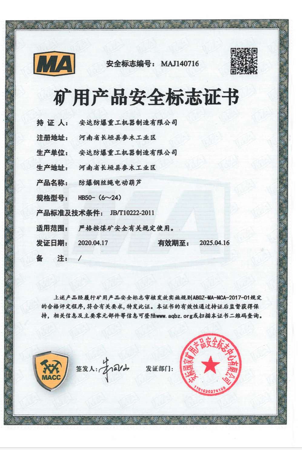 防爆鋼絲繩葫蘆橋式起重機(jī) 礦用產(chǎn)品安全標(biāo)志證書