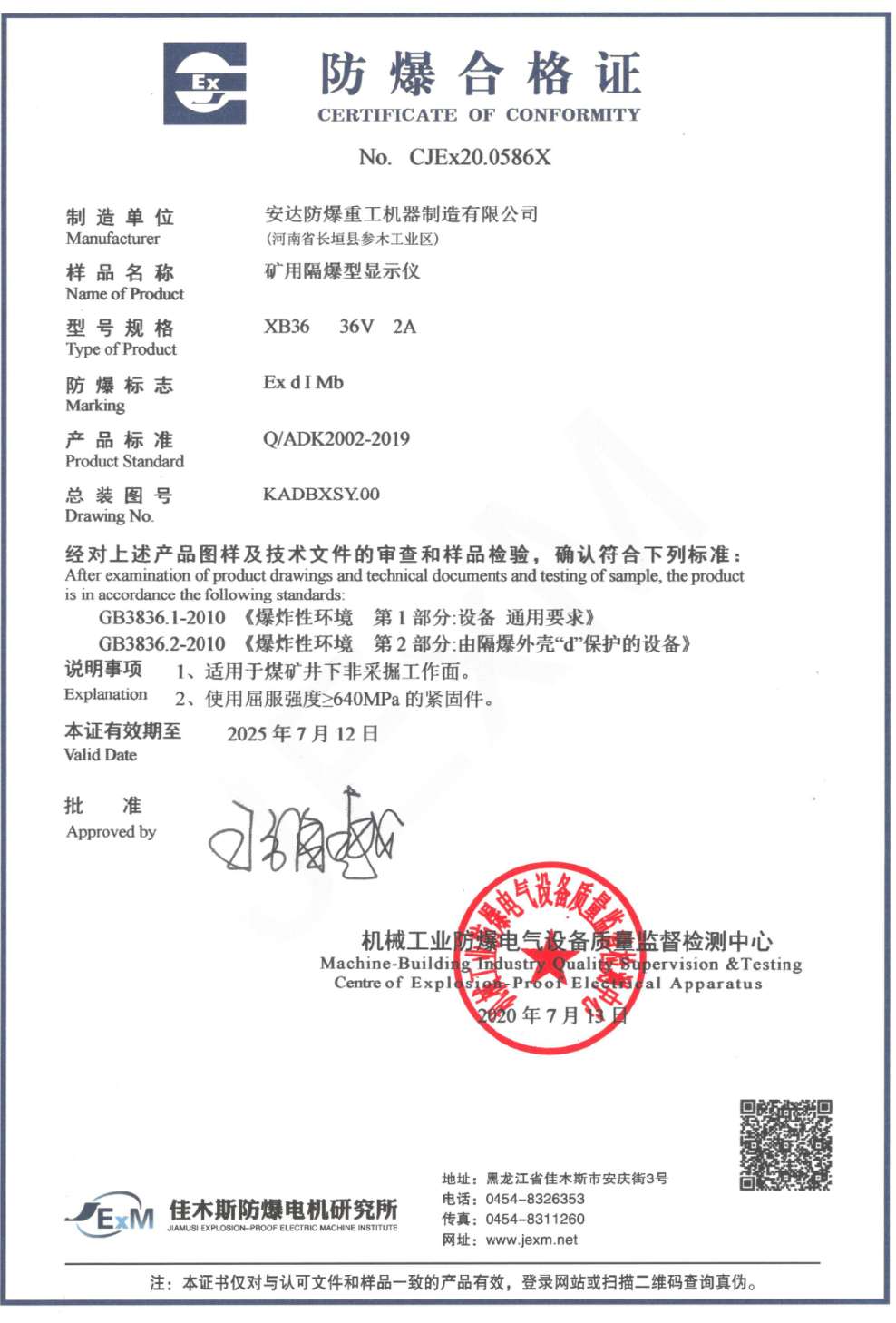 | 發(fā)證機(jī)構(gòu): | 機(jī)械工業(yè)防爆電氣質(zhì)量監(jiān)督檢測中心 | 發(fā)證時間 : | 2020-07-13 |
