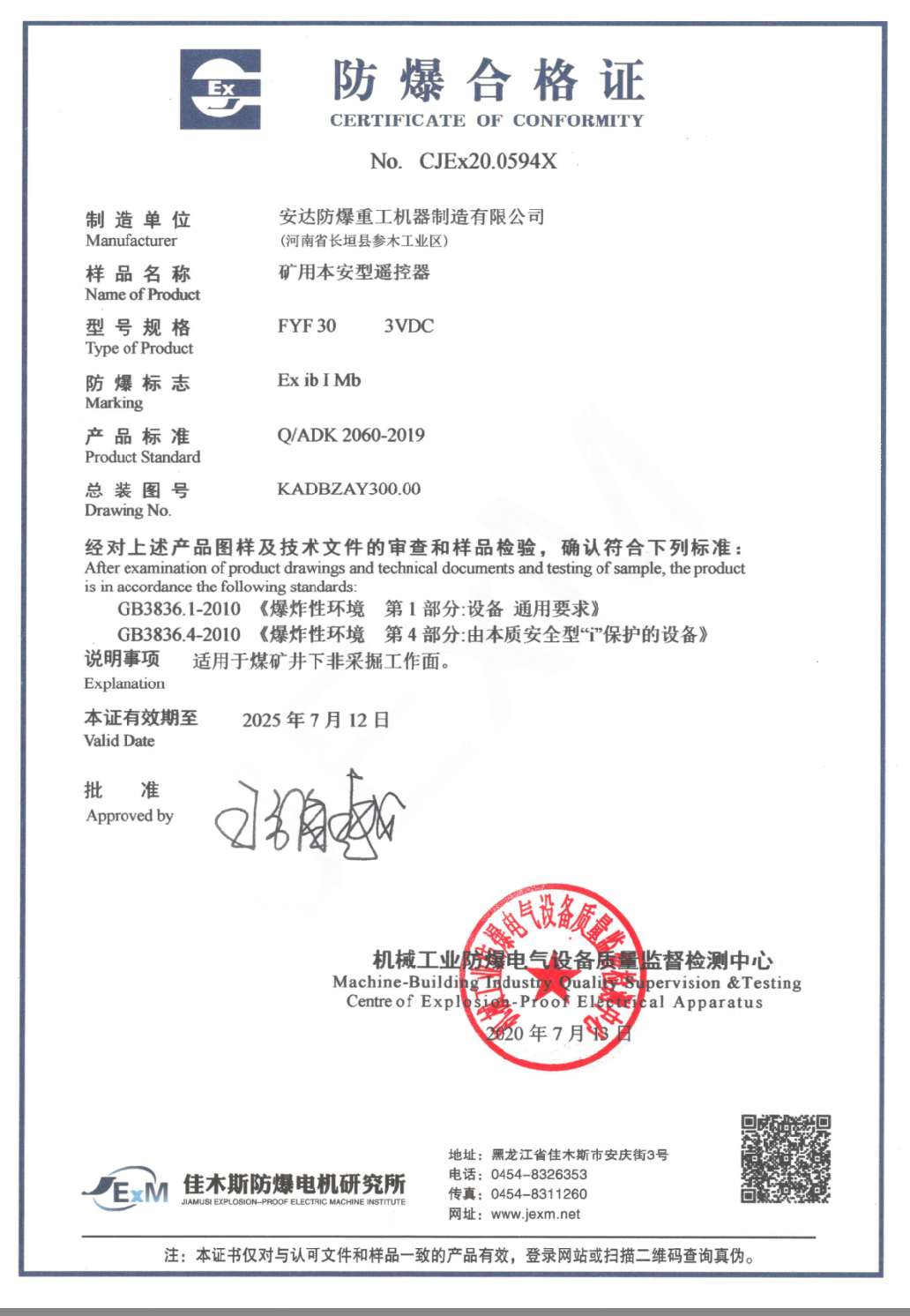 榮譽(yù)資質(zhì) 礦用本安型遙控器 防爆合格證