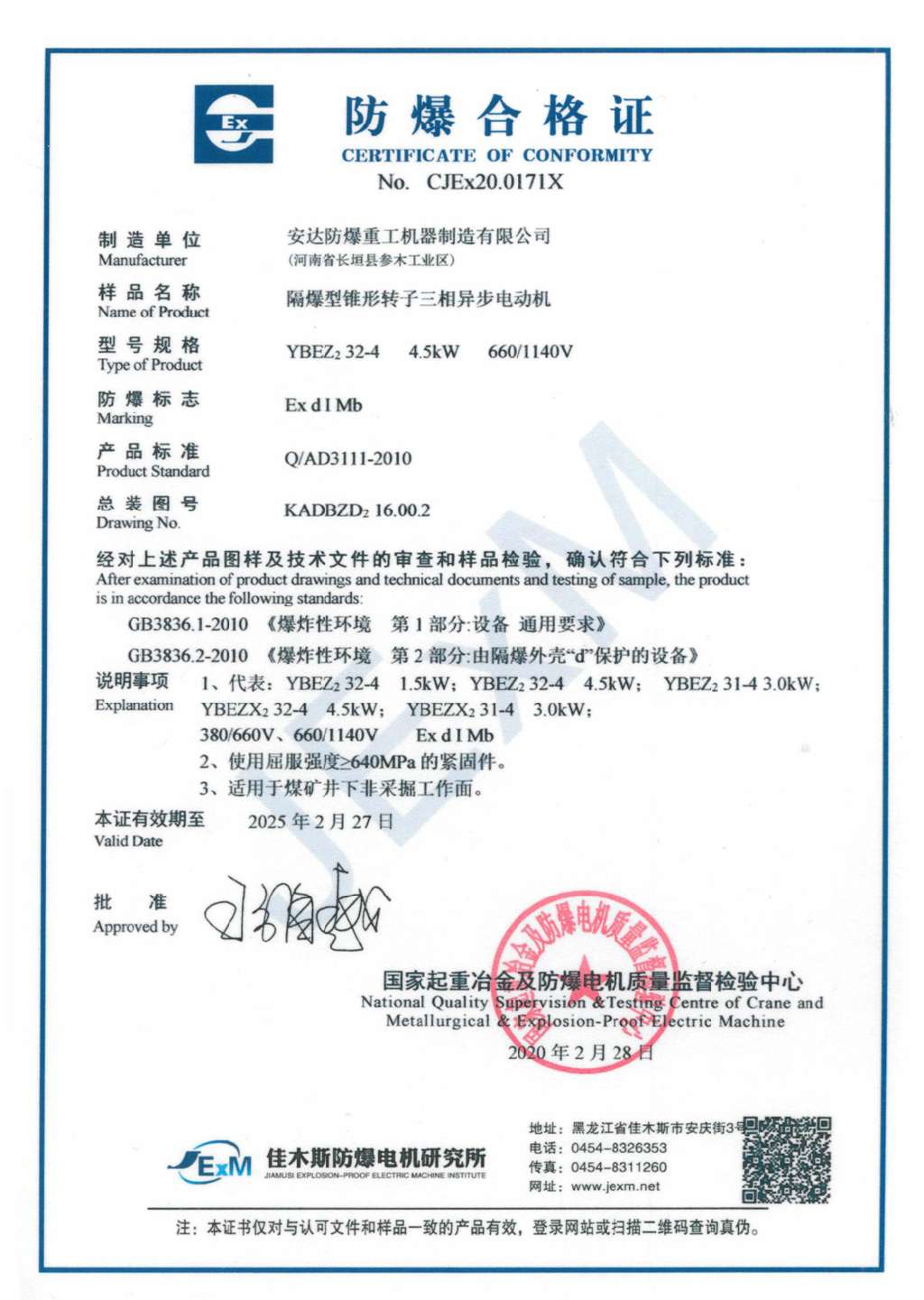 | 發(fā)證機(jī)構(gòu): | 國家起重冶金及防爆電機(jī)質(zhì)量監(jiān)督檢測中心 | 發(fā)證時間 : | 2020-02-28 |