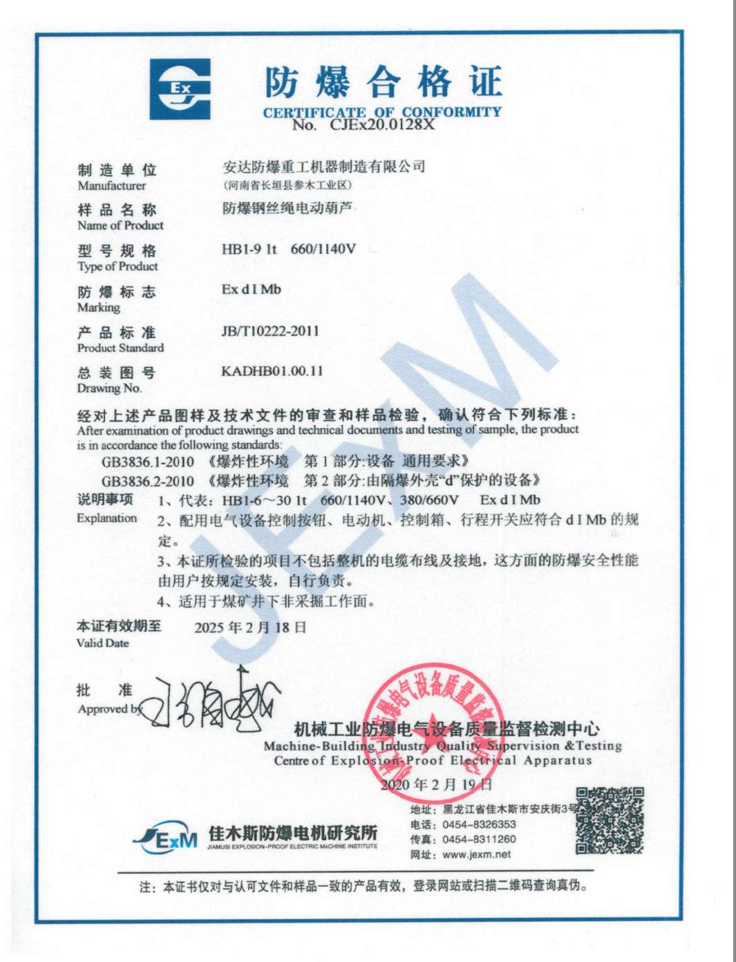 榮譽(yù)資質(zhì) 防爆鋼絲繩電動(dòng)葫蘆 防爆合格證