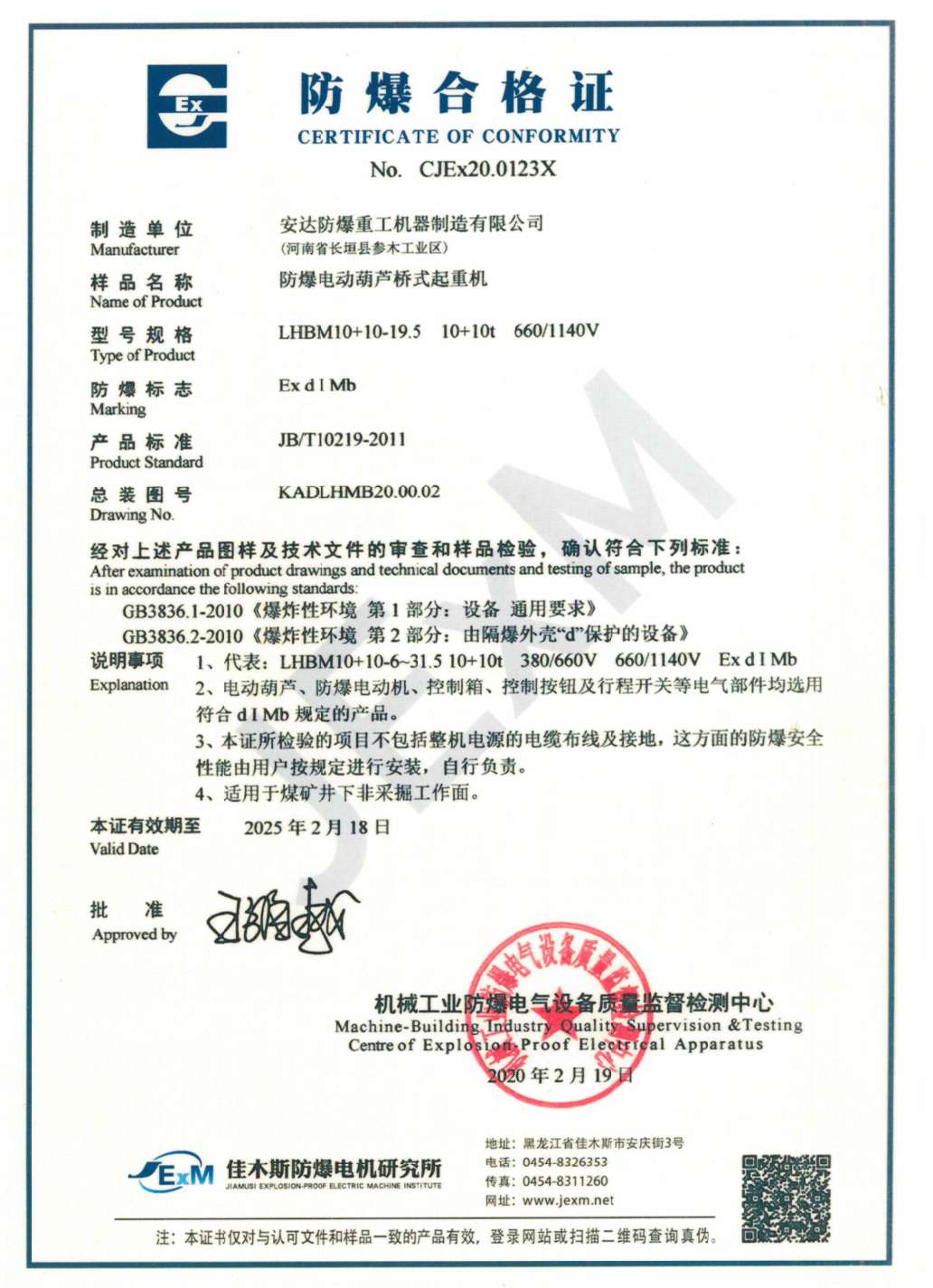 榮譽(yù)資質(zhì) 防爆電動(dòng)葫蘆橋式起重機(jī) 防爆合格證