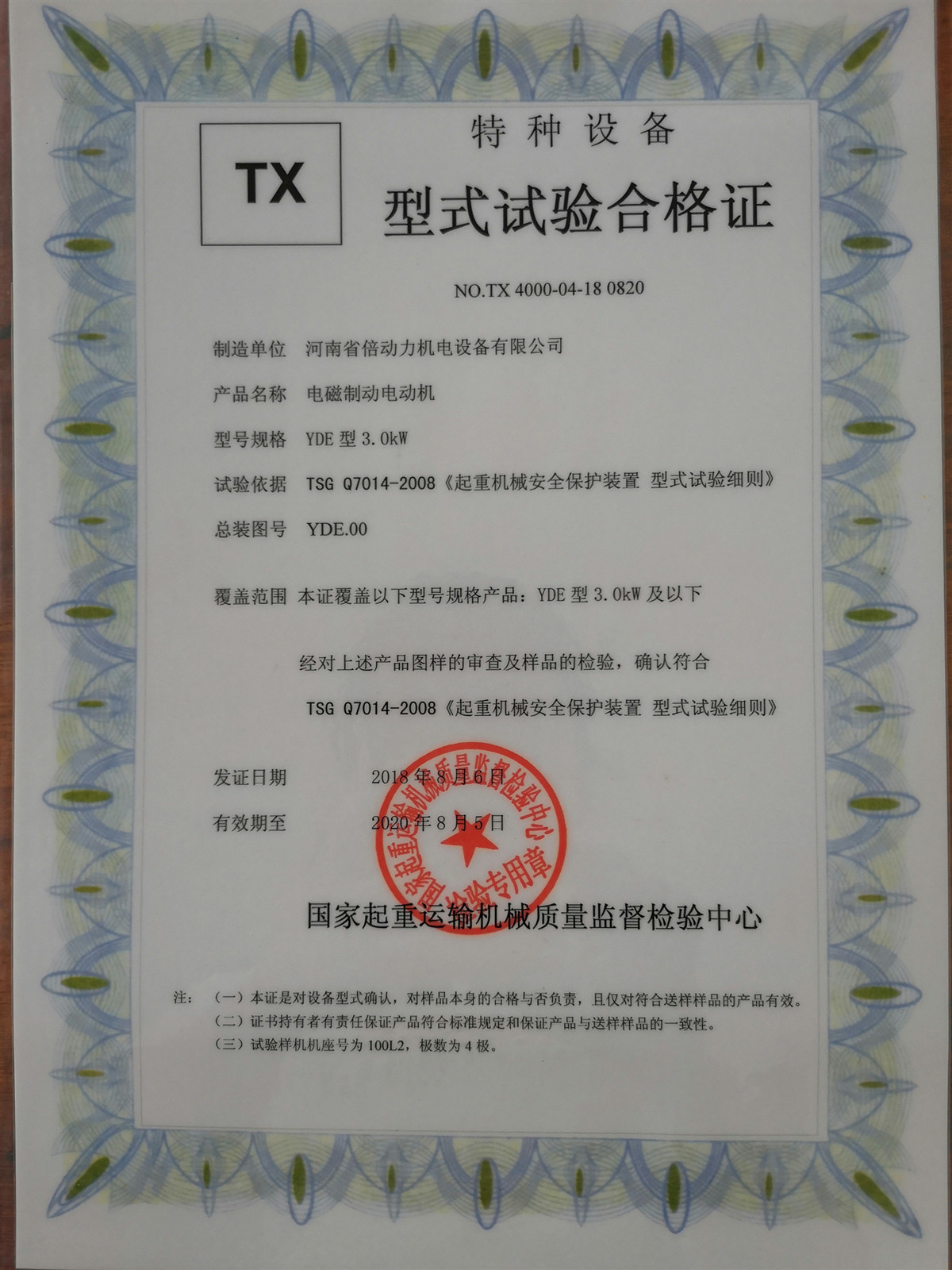 | 發(fā)證機構(gòu): | 國家起重運輸機械質(zhì)量監(jiān)督檢驗中心 | 發(fā)證時間 : | 2018-08-06 |