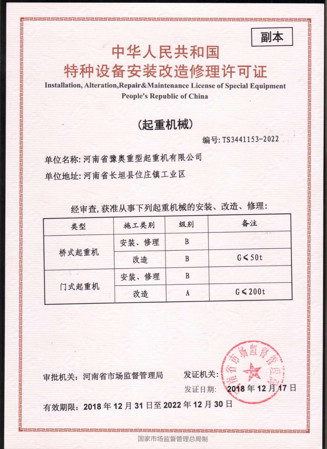 » 特種設(shè)備安裝改造修理許可證