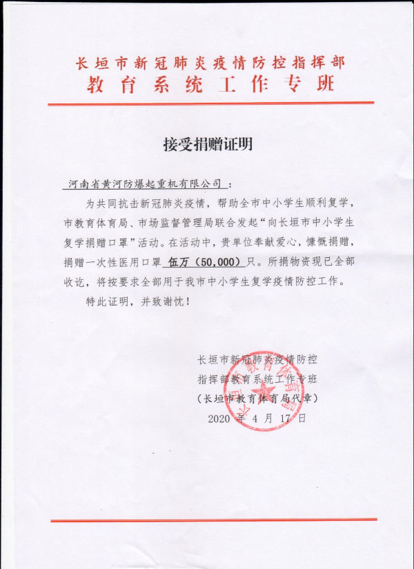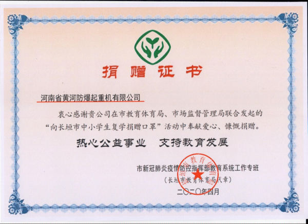 疫情無情,人間有愛。在長垣市校園疫情防控和復學工作中,河南省黃河防爆起重機有限公司及時伸出援手、奉獻愛心,用“愛心口罩”助力學生復學、護佑學生安全,以實際行動支持校園疫情防控和教育事業(yè)發(fā)展。河南省黃河防爆起重機有限公司以及其他公司善行義舉不僅感人至深,也必將在廣大學生的心中播下愛的種子。