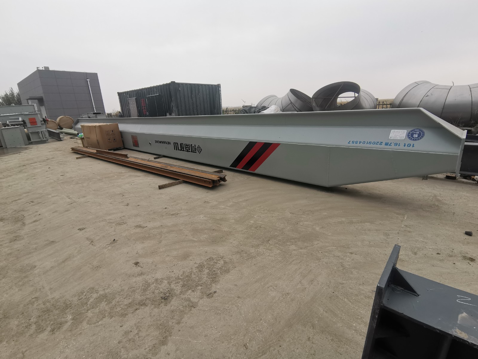 橋架是橋式起重機(jī)的基本構(gòu)件,它由主梁、端梁、走臺(tái)等部分組成。主梁跨架在跨間上空,有箱形、析架、腹板、圓管等結(jié)構(gòu)形式。主梁兩端連有端梁,在兩主梁外側(cè)安有走臺(tái),設(shè)有安全欄桿。在駕駛室一側(cè)的走臺(tái)上裝有大車(chē)移行機(jī)構(gòu),在另一側(cè)走臺(tái)上裝有往小車(chē)電氣設(shè)備供電的裝置,即輔助滑線。在主梁上方鋪有導(dǎo)軌,供小車(chē)移動(dòng)。整個(gè)橋式起重機(jī)在大車(chē)移動(dòng)機(jī)構(gòu)拖動(dòng)下,沿車(chē)間長(zhǎng)度方向的導(dǎo)軌上移動(dòng)。