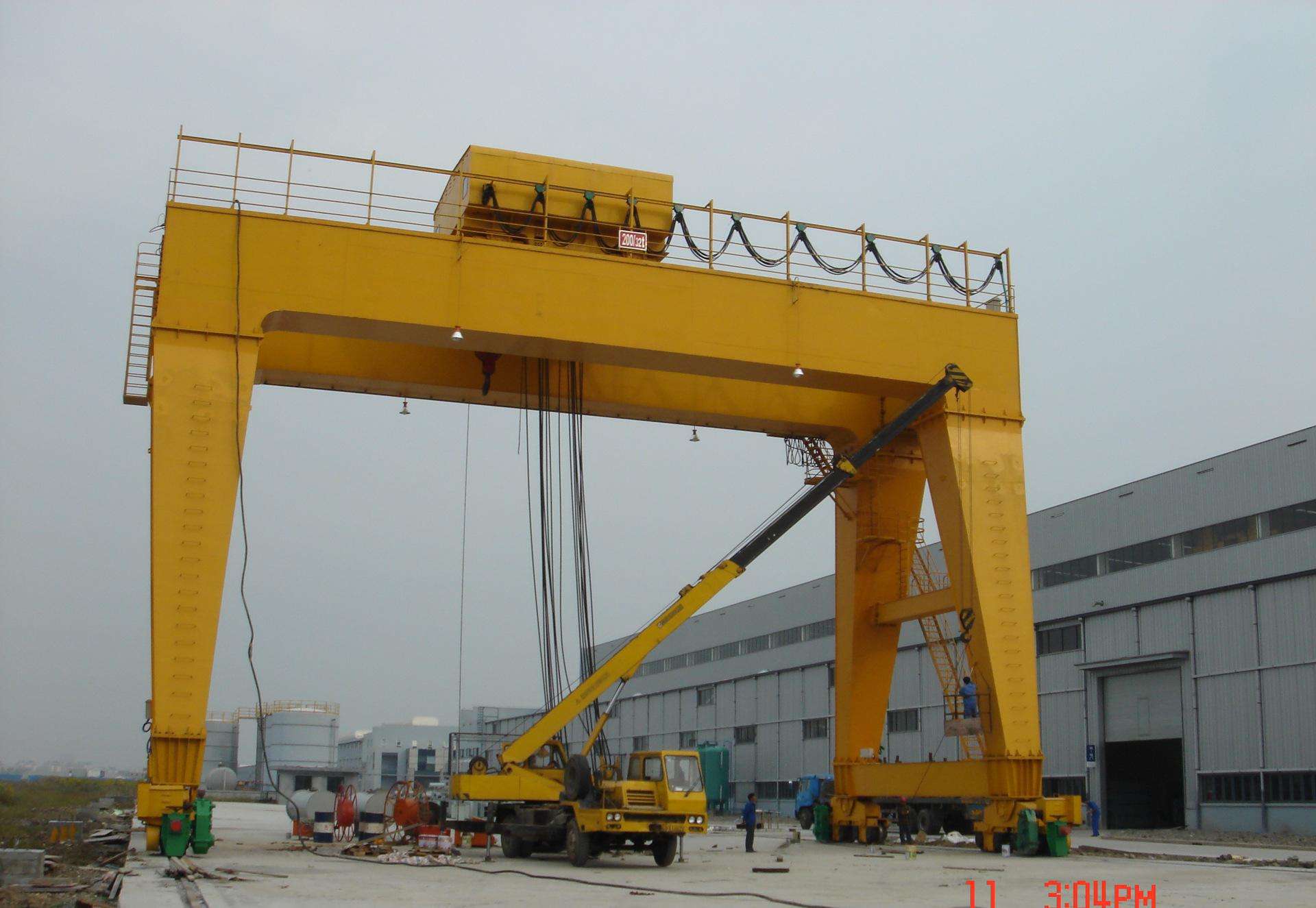 軌道式吊鉤龍門起重機(jī)的整體特征為箱形、偏軌箱形主梁懸臂龍門架構(gòu)。