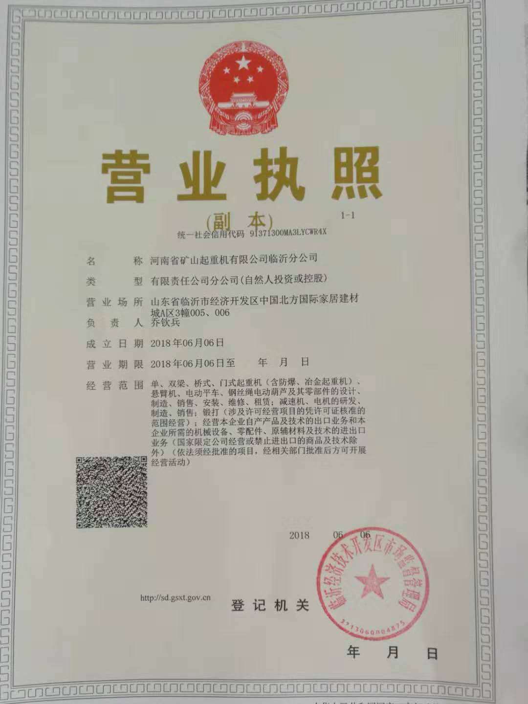 | 發(fā)證機(jī)構(gòu): | 臨沂經(jīng)濟(jì)開發(fā)區(qū)市場監(jiān)督管理總局 | 發(fā)證時間 : | 2018-06-06 |