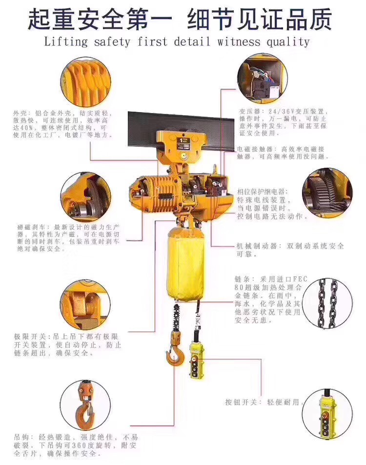 本公司產(chǎn)品品種齊全,質(zhì)量可靠,價格合理,售后服務周到。還可根據(jù)用戶要求,設計各種非標電動葫蘆和非標起重機。愿本公司的產(chǎn)品,成為貴單位理想的選擇。