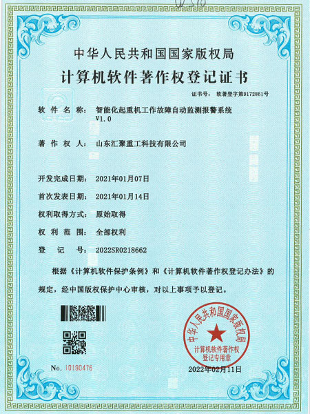 榮譽(yù)資質(zhì) 智能化起重機(jī)工作故障自動(dòng)監(jiān)測(cè)報(bào)警系統(tǒng) v1.0(自動(dòng)化證書)