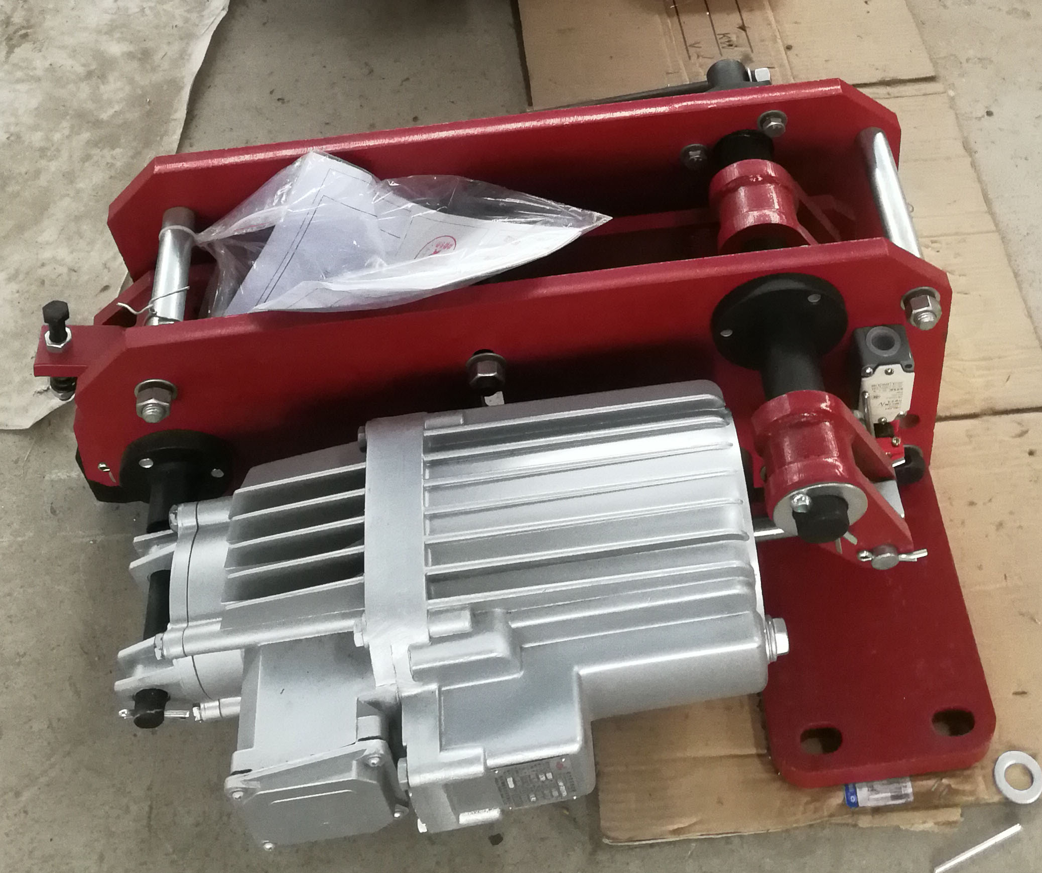 該產(chǎn)品通電時(shí),電力液壓推動(dòng)器動(dòng)作,其推推桿迅速升起,并通過(guò)杠桿和傳念頭構(gòu)將鐵楔提起,使起重機(jī)正常工作;