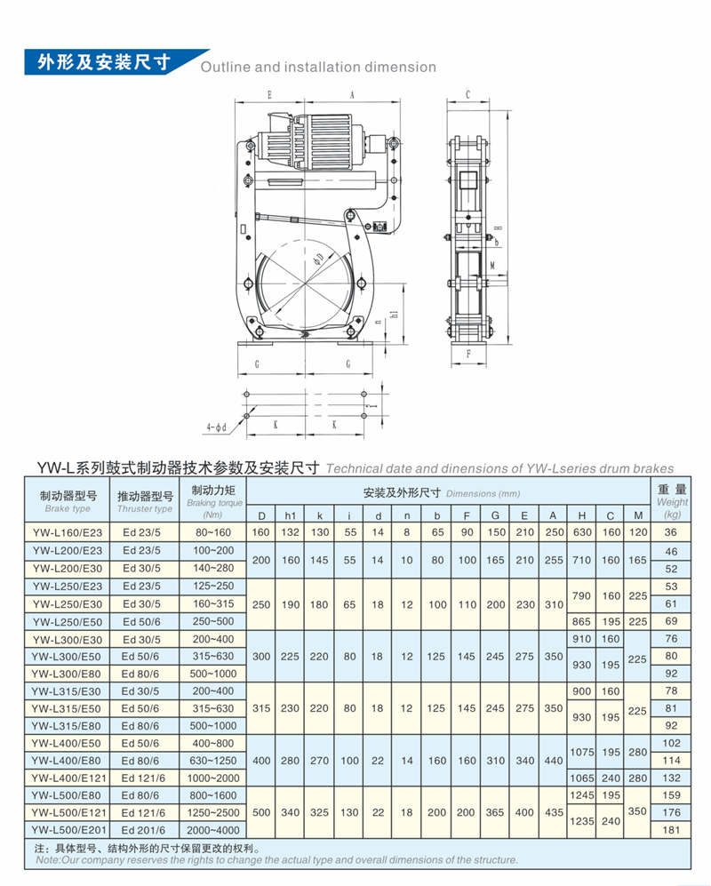 YW-L系列電力液壓鼓式制動(dòng)器連接尺寸和技術(shù)要求符合JB/T6406-2006標(biāo)準(zhǔn),制動(dòng)力矩參數(shù)符合DIN15435標(biāo)準(zhǔn),配套符合DIN15430標(biāo)準(zhǔn)的ED推動(dòng)器;本系列主要適用于安裝空間較小,YWZ4、YWZ9、YWZ8等形式無(wú)法布置的場(chǎng)所。