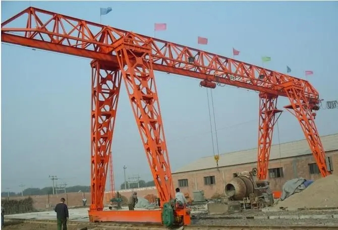 它的金屬結(jié)構(gòu)像門形框架,承載主梁下安裝兩條支腳,可以直接在地面的軌道上行走,主梁兩端可以具有外伸懸臂梁。