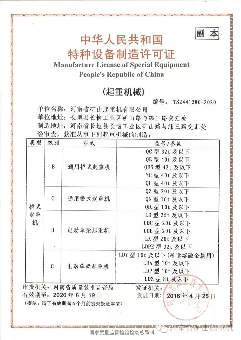 » 中華人民共和國特種設備制造許可證