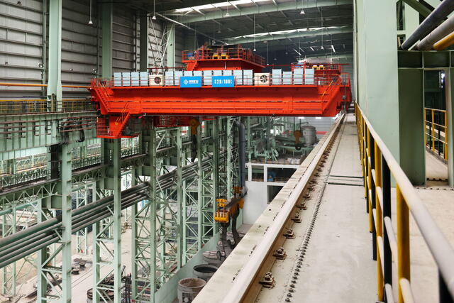 該產品采用四梁四軌雙小車結構型式,主體結構在垂直及水平載荷作用下,具有很好的強度和剛度。大車車輪采用20輪布置方式,力學模型簡單,輪壓分布均衡,可有效降低廠房鋼結構造價。 整機采用調速控制系統(tǒng),運行平穩(wěn)、安全,起、制動沖擊小,同時起升調速裝置采用一用一備系統(tǒng),當一套裝置發(fā)生故障時,可實現安全、快速切換,保證起升系統(tǒng)正常運行。 車輪組采用新系列標準45°剖分式鍛造車輪,具有承載能力高、防塵、使用壽命長、更換維護方便等特點。