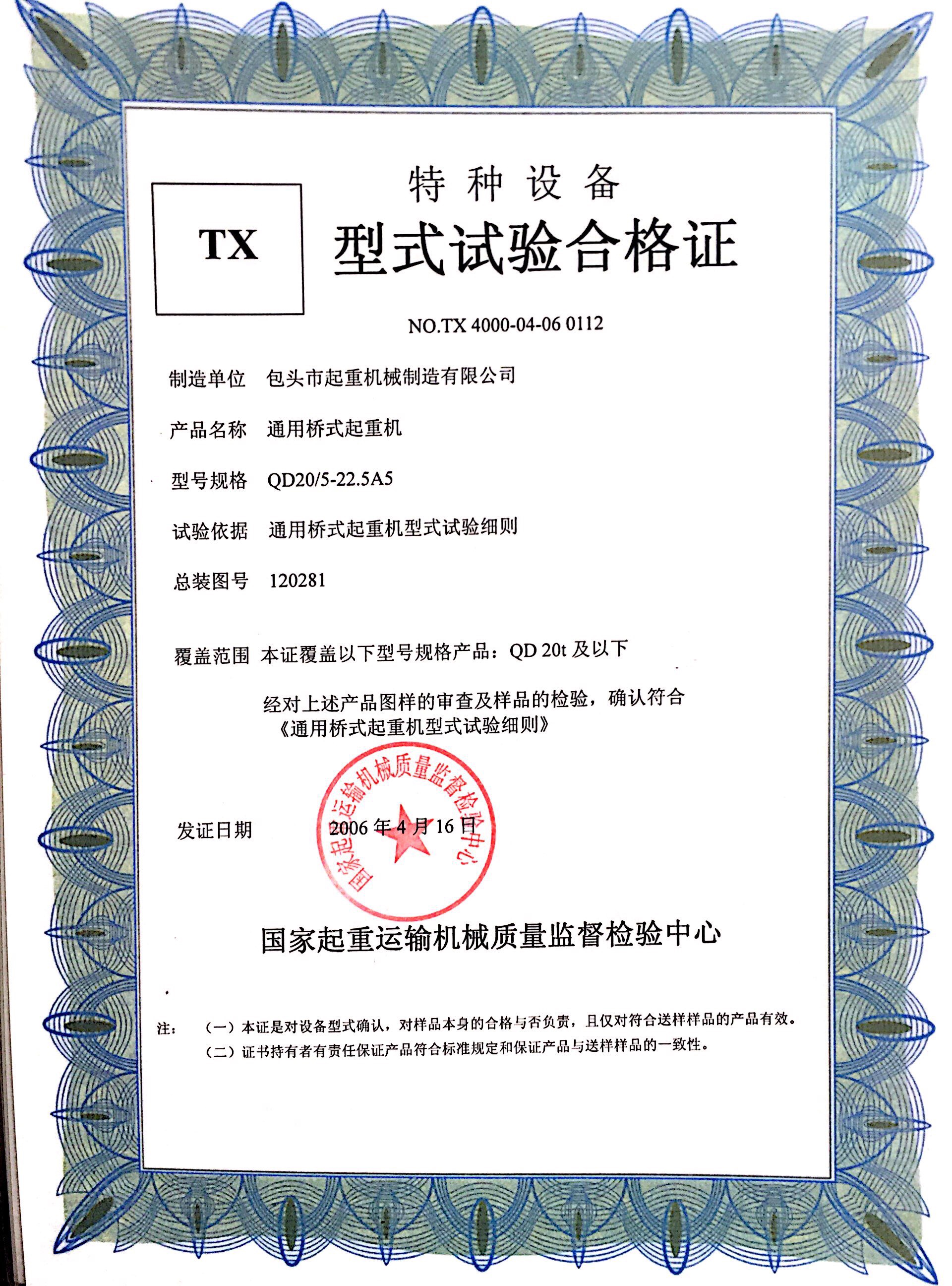 | 發(fā)證機(jī)構(gòu): | 國(guó)家起重運(yùn)輸機(jī)械質(zhì)量監(jiān)督檢驗(yàn)中心 | 發(fā)證時(shí)間 : | 2006-04-16 |