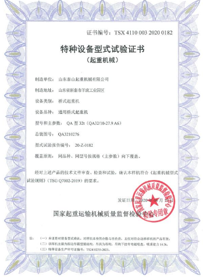 榮譽資質(zhì) 特種設(shè)備型式試驗證書 (起重機(jī)械)橋式起重機(jī) (通用橋式起重機(jī))