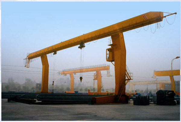門式起重機(jī)是橋式起重機(jī)的一種變形,又叫龍門吊。主要用于室外的貨場、料場貨、散貨的裝卸作業(yè)。它的金屬結(jié)構(gòu)像門形框架,承載主梁下安裝兩條支腳,可以直接在地面的軌道上行走,主梁兩端可以具有外伸懸臂梁。門式起重機(jī)具有場地利用率高、作業(yè)范圍大、適應(yīng)面廣、通用性強(qiáng)等特點,在港口貨場得到廣泛使用。