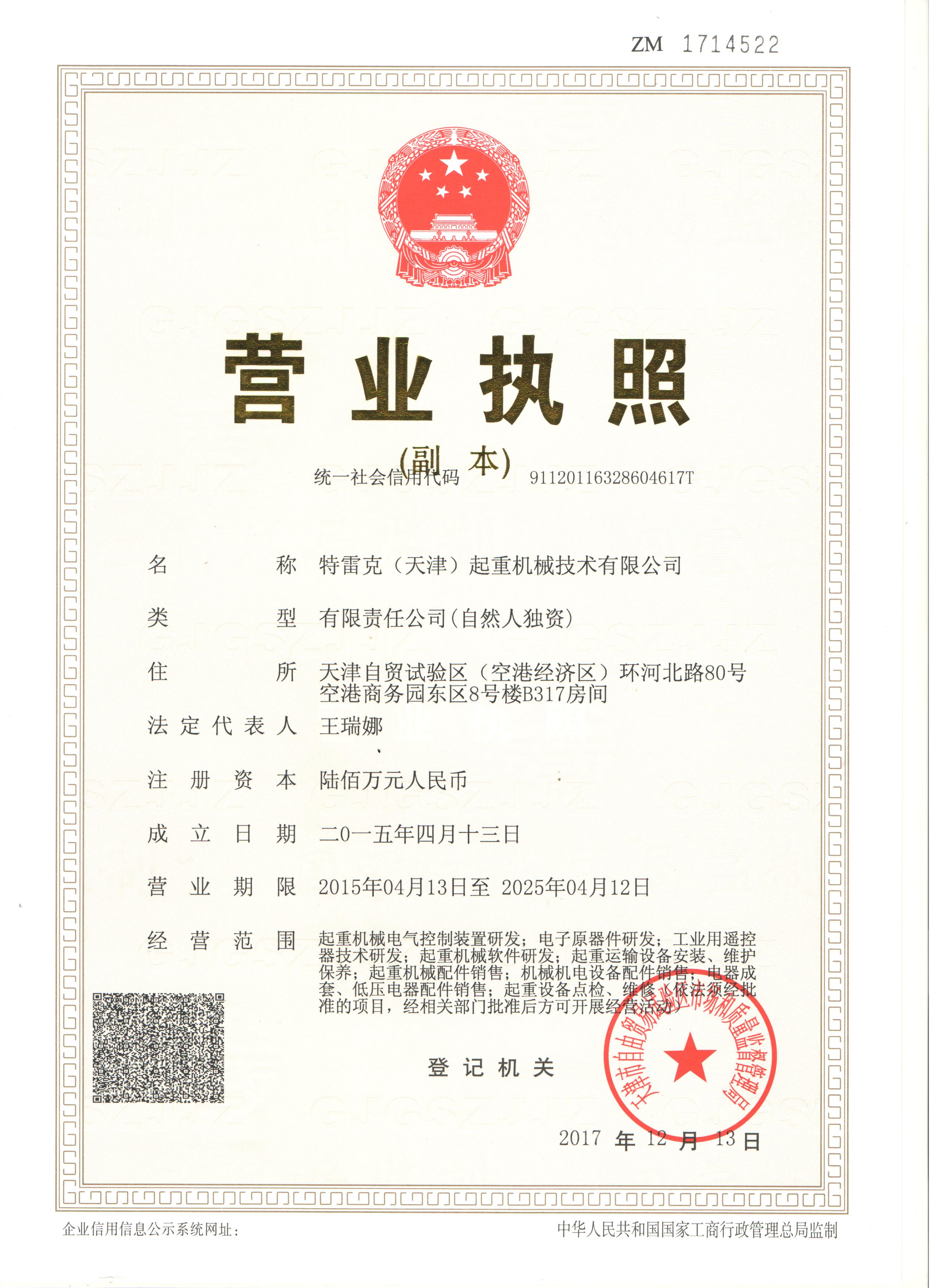 證書介紹 2015年特雷克(天津)起重機(jī)械技術(shù)有限公司正式成立,主營起重機(jī)械電氣控制裝置研發(fā),電子元器件研發(fā),工業(yè)用遙控器技術(shù)研發(fā),起重機(jī)械軟件研發(fā),起重運(yùn)輸設(shè)備安裝,維修和保養(yǎng),起重機(jī)械配件銷售,機(jī)械機(jī)電設(shè)備配件銷售,電器成套,低壓電器配件銷售,起重設(shè)備點(diǎn)檢維修等經(jīng)相關(guān)部門批準(zhǔn)可開展經(jīng)營**。