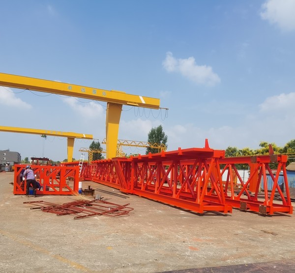 架橋機(jī)的主要結(jié)構(gòu)包括主梁、導(dǎo)梁、支腿、起吊天車、橫移機(jī)構(gòu)、縱移機(jī)構(gòu)、電氣控制系統(tǒng)等部分。其中,主梁是架橋機(jī)的主要承載結(jié)構(gòu),導(dǎo)梁則用于引導(dǎo)架橋機(jī)前進(jìn)的方向,支腿用于支撐架橋機(jī)的重量和保證穩(wěn)定性,起吊天車則用于吊裝和拼裝橋梁構(gòu)件。橫移機(jī)構(gòu)和縱移機(jī)構(gòu)則分別用于實(shí)現(xiàn)架橋機(jī)在橫向和縱向上的移動(dòng)和定位。
