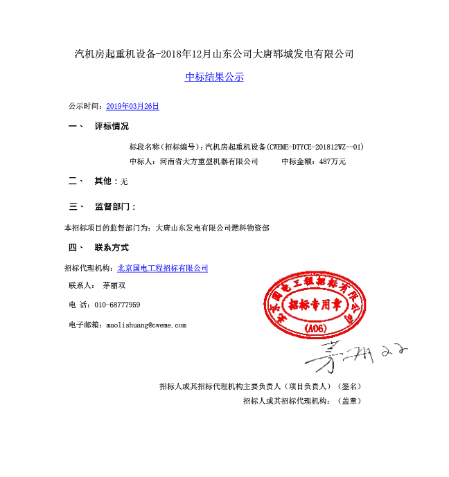 移動版:【汽機房起重機設備、電子稱重皮帶式給煤機設備-2018年12月山東公司大唐鄆城發(fā)電有限公司】中標結果公示