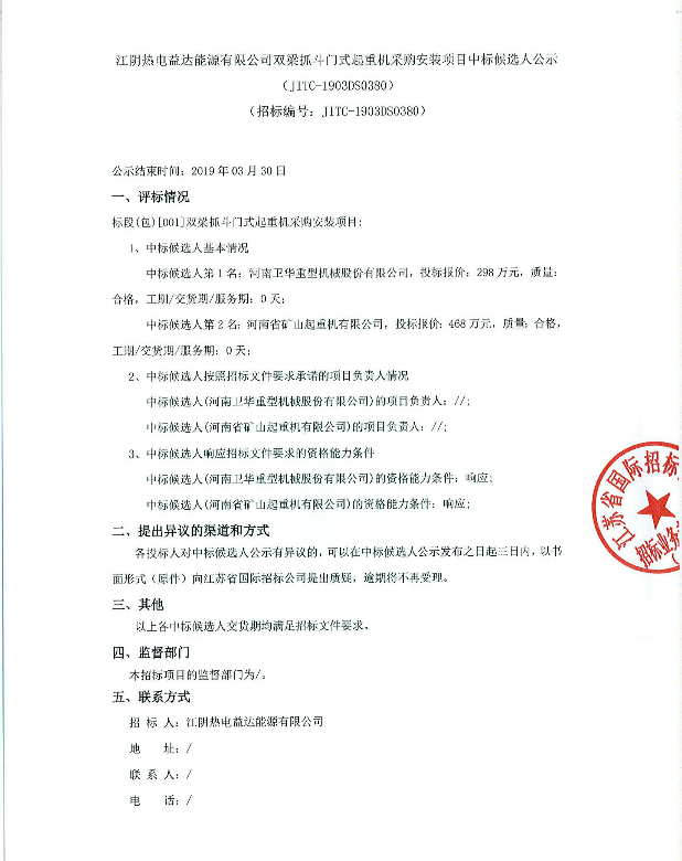 移動(dòng)版:江陰熱電益達(dá)能源有限公司雙梁抓斗門(mén)式起重機(jī)采購(gòu)安裝項(xiàng)目中標(biāo)候選人公示