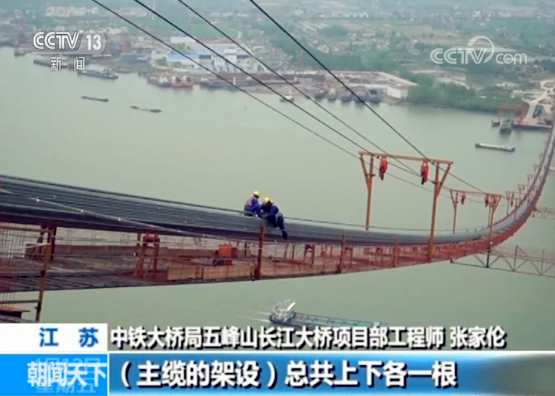 中鐵大橋局五峰山長(zhǎng)江大橋項(xiàng)目部工程師 張家倫:這個(gè)貓道總長(zhǎng)大概是1900米,最高點(diǎn)是在我們主塔這個(gè)地方,距離我們江面170多米,最低點(diǎn)距江面大概110米。主纜牽引的過(guò)程中,施工人員是要一直跟著主纜走。從北岸一直跟到南岸。觀察它的扭轉(zhuǎn),斷絲情況,都需要人員在貓道面上進(jìn)行行走觀察。