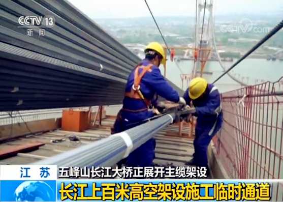 在現(xiàn)場(chǎng)記者看到,每一根主纜是由352根索股組成,每根索股長(zhǎng)度約2000米,重約47.8噸,全部安裝到位后組成的主纜直徑將達(dá)到1.3米,而要想完成主纜架設(shè),單靠機(jī)械還不行,必須配合人工輔助。為此,在長(zhǎng)江上的百米高空,施工人員架設(shè)起了與主纜平行的臨時(shí)通道,這條通道是由鋼絲和木板組成,工人們因?yàn)橐?jīng)常貓著腰施工,因此也管它叫貓道。
