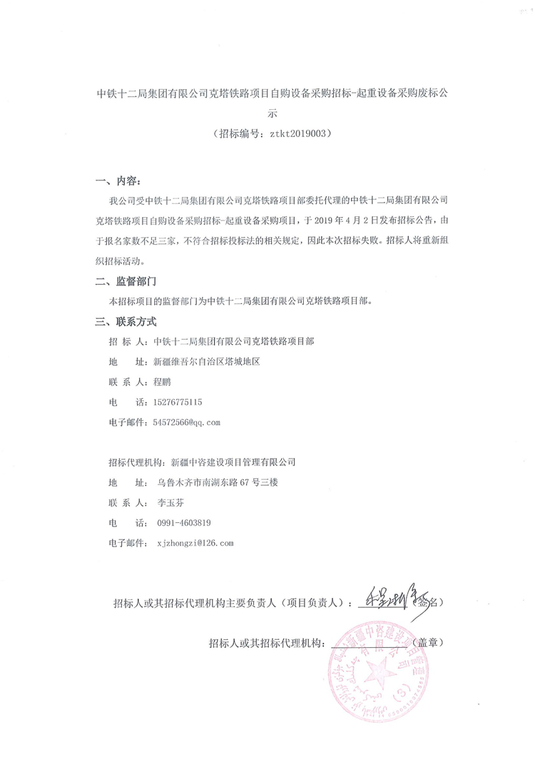 移動版:中鐵十二局集團有限公司克塔鐵路項目自購設(shè)備采購招標-起重設(shè)備采購廢標公示