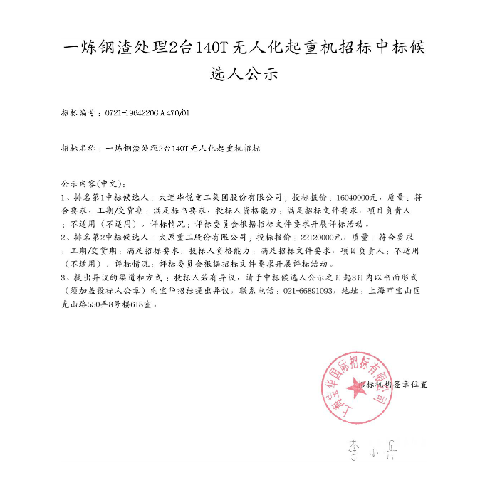 移動版:一煉鋼渣處理2臺140T無人化起重機(jī)招標(biāo)中標(biāo)候選人公示