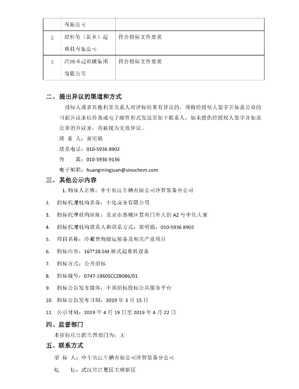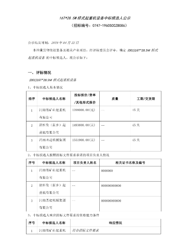 16T*28.5M橋式起重機(jī)設(shè)備中標(biāo)候選人公示