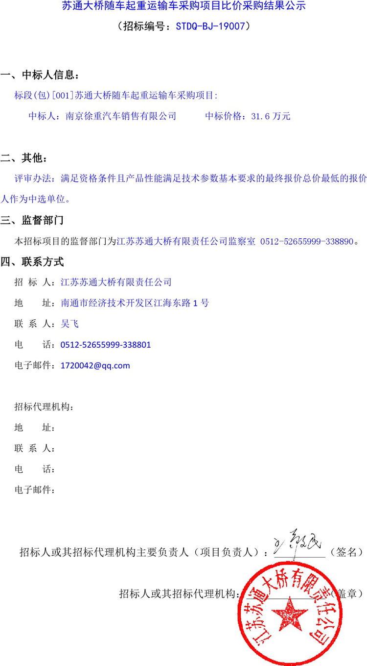 蘇通大橋隨車起重運輸車采購項目比價采購結(jié)果公示
