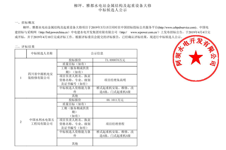 柳坪水電站柳坪雅都水工機(jī)械設(shè)備及起重設(shè)備大修中標(biāo)候選人公示