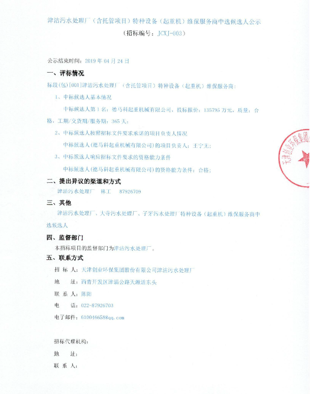 津沽污水處理廠(含托管項(xiàng)目)特種設(shè)備(起重機(jī))維保服務(wù)商中選候選人公示
