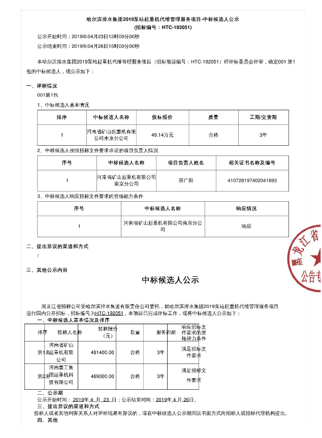 移動版:哈爾濱排水集團(tuán)2019泵站起重機(jī)代維管理服務(wù)項目-中標(biāo)候選人公示