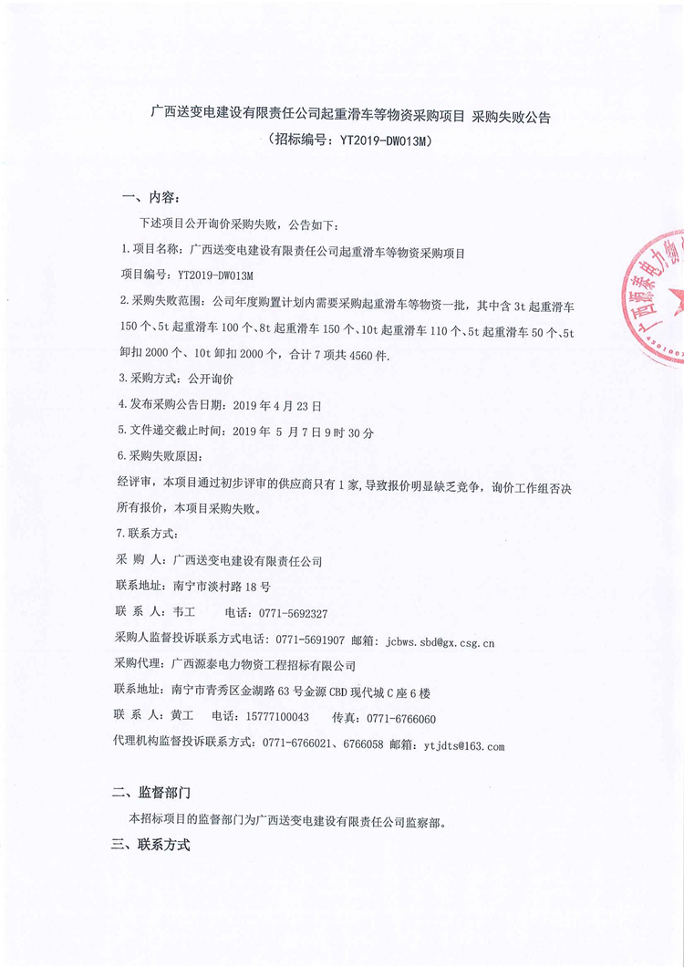 廣西送變電建設(shè)有限責(zé)任公司起重滑車等物資采購項(xiàng)目 采購失敗公告
