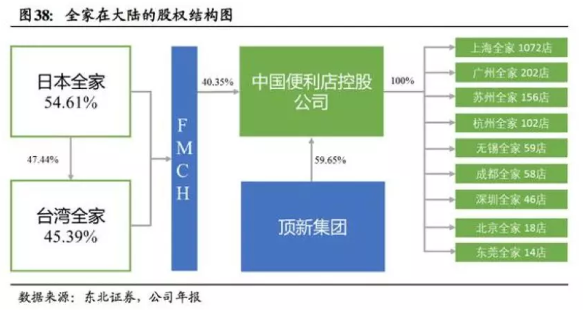 2004年,全家正式進(jìn)入國內(nèi)市場,而背后實際控制公司則是中國便利店控股公司,其中頂新集團(tuán)占股59.65%,臺灣全家占股約18.35%,剩余股權(quán)則由日本全家、伊藤忠商事株式會社、FMCH(FamilyMart China Holding)共同持有。