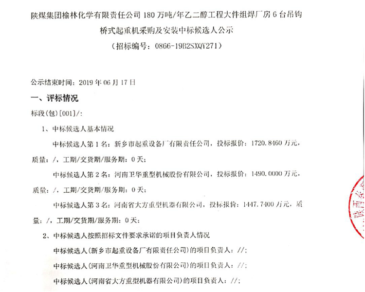 移動版:陜煤集團(tuán)榆林化學(xué)有限責(zé)任公司180萬噸/年乙二醇工程大件組焊廠房6臺吊鉤橋式起重機(jī)采購及安裝中標(biāo)候選人公示