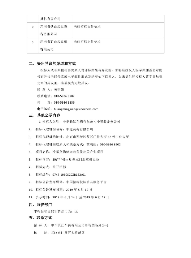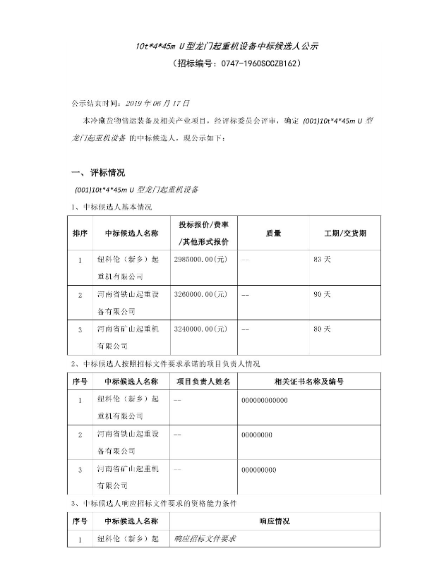 10t*4*45m U型龍門(mén)起重機(jī)設(shè)備中標(biāo)候選人公示