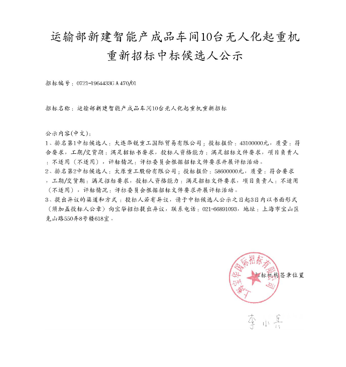 移動版:運輸部新建智能產(chǎn)成品車間10臺無人化起重機重新招標中標候選人公示