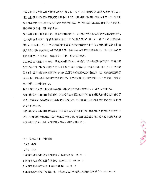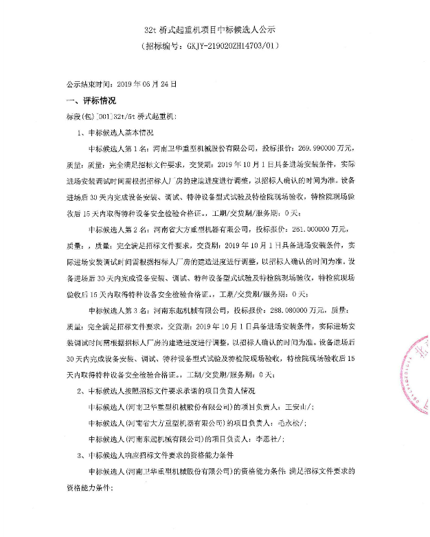 32t橋式起重機(jī)項(xiàng)目中標(biāo)候選人公示