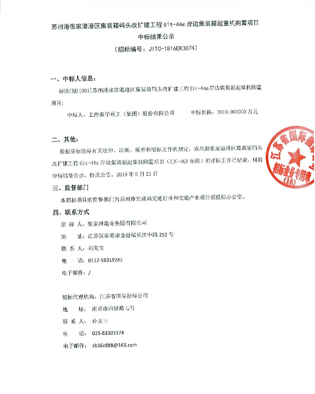 蘇州港張家港港區(qū)集裝箱碼頭改擴(kuò)建工程61t-44m岸邊集裝箱起重機(jī)購(gòu)置項(xiàng)目中標(biāo)結(jié)果公示