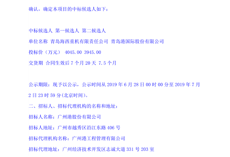廣州港股份有限公司3臺四連桿門座起重機購置項目中標(biāo)候選人公示
